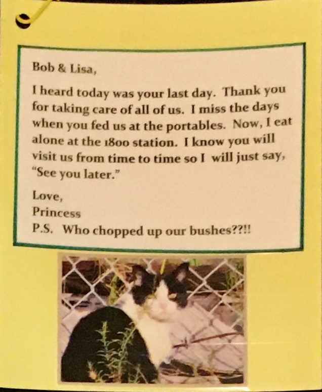 Long time volunteers retire from our feeding program. Bob and Lisa have been part of our feeding program for 6 yrs, and they will still be a part of our group but will retire from the monthly feeding. If anyone is interested in volunteering to feed either a weekday or a weekend day, please email us at info@campuscatcoalition.com!